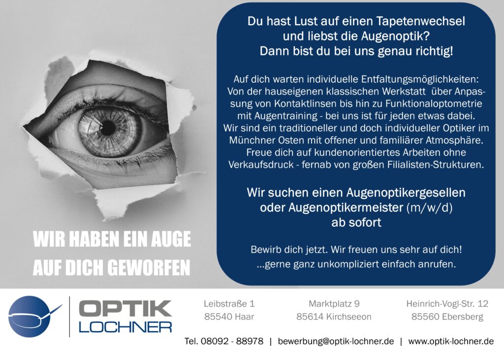 Willkommen bei Optik Lochner, Ihrem Partner für scharfes Sehen und stilvolles Aussehen! Als erfahrene Augenoptiker bieten wir Ihnen maßgeschneiderte Lösungen für Ihre Sehkraft – von individuellen Sehtests über hochwertige Brillen und Kontaktlinsen bis hin zu umfassender Beratung und modernster Technik. Unser engagiertes Team steht Ihnen mit Fachwissen und persönlicher Betreuung zur Seite, um Ihre Augen optimal zu versorgen. Vertrauen Sie auf unsere Expertise und entdecken Sie bei uns die perfekte Kombination aus Funktionalität und Design. Sehen Sie klar, fühlen Sie sich wohl – wir sind für Sie da!